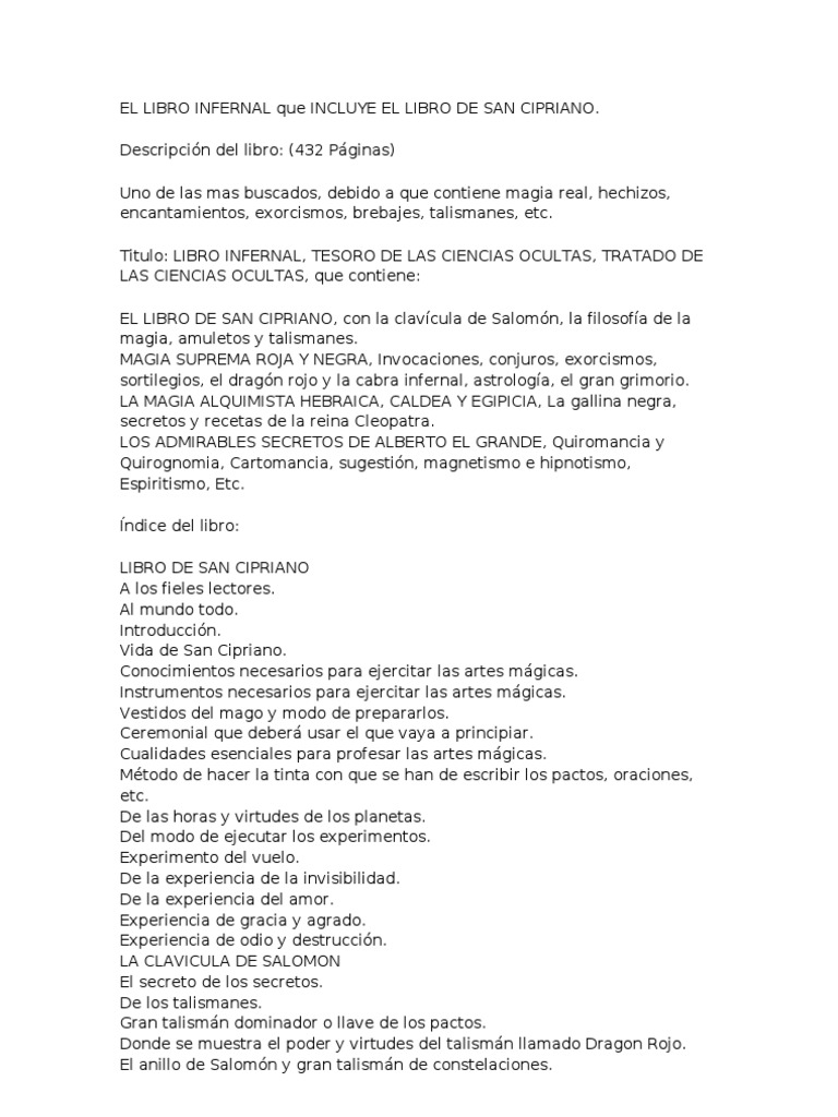 Martes demasiadas emociones je, como manana estudios fuera interesante ahora buscar documentos o buscar archivos es muy fácil con 01libros.net buscador de descargas por documentos pdf, archivos, descargas pdf gratis. Descargar el libro infernal tesoro de las ciencias ocultas es uno de los libros de ccc revisados aquí. En el nombre de san cipriano y de parte de dios tres veces santo, por la potestad de los espíritus, superiores adonai, eloim y jehovan y mitraton, yo n (1), absuelvo el cuerpo de n. Con todo ello os persignáis en el lugar en que debe hacerse la gran obra, poniendo especial cuidado en realizar el gran círculo cabalístico, cumpliendo punto por punto las enseñanzas que se contienen en este Libro gratis es una de las tiendas en línea favoritas para comprar libro de magia el dragón rojo para descargar gratis en pdf a precios mucho más bajos de lo que pagaría si compra en amazon y otros servicios similares.